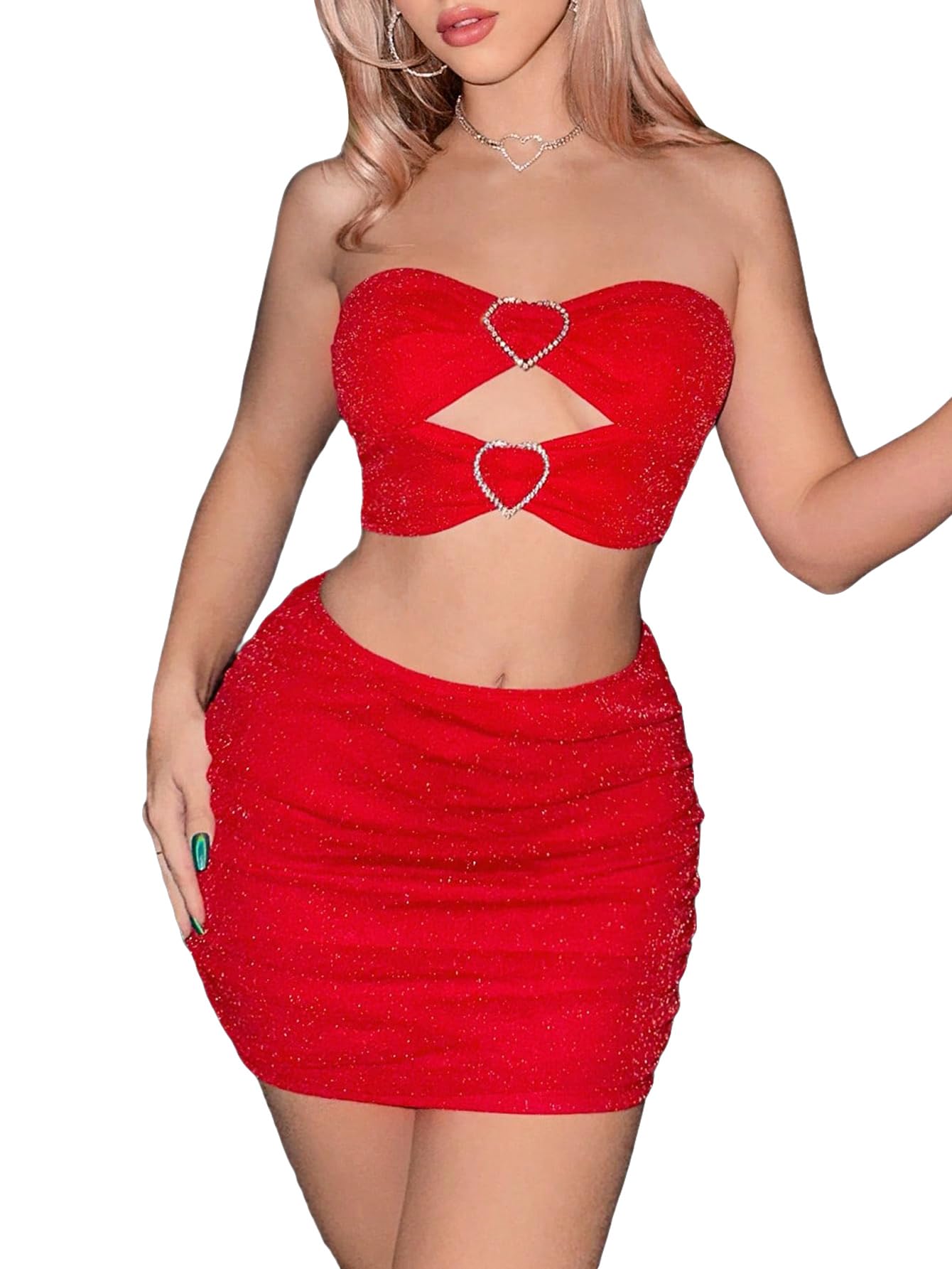 BEAUDRM Women's Y2K 2 Piece Heart Shaped Rhinestone Sleeveless Cut Out Bandeau Crop Top Tube and Bodycon Mini Skirt Sets Red X-Small