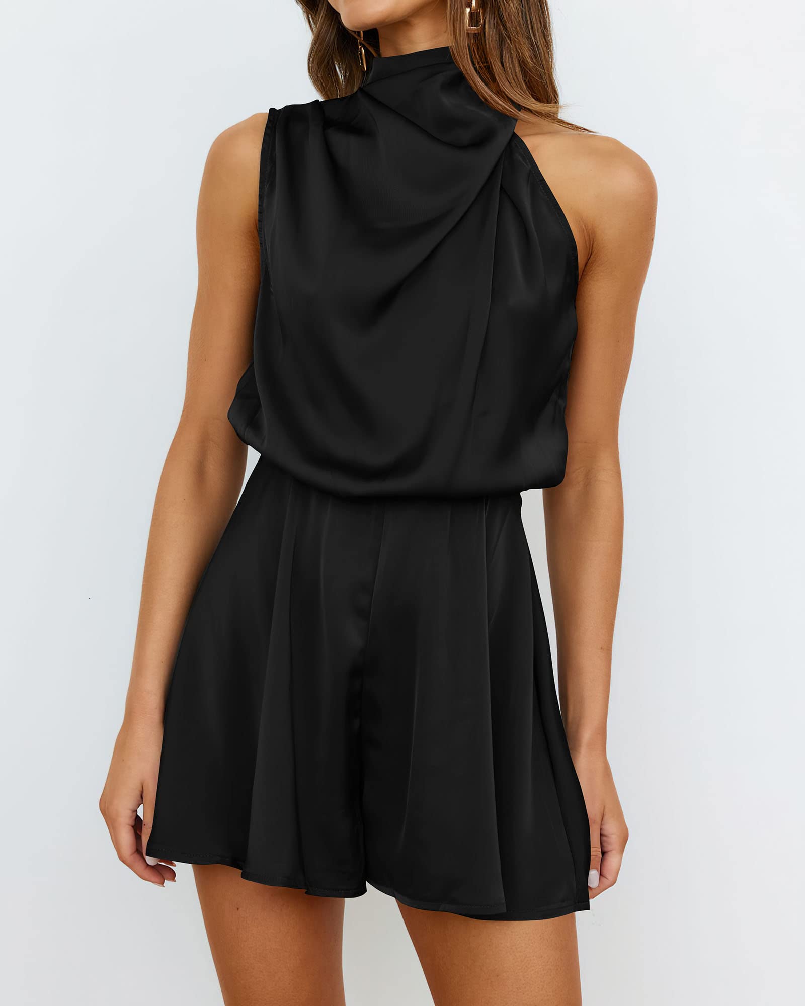 • FEATURES: S=US 4-6, M=US 8-10, L=US 12-14, XL=US 16-18, XXL=US 20-22 / Summer Satin Romper / One Piece Romper Outfits / Formal Romper For Women / Mock Neck / Sleeveless / Irregular Armholes / Keyhole Buttons And Zipper Closure At Back / Empire Waist / Pockets / Cocktail Shorts Jumpsuit