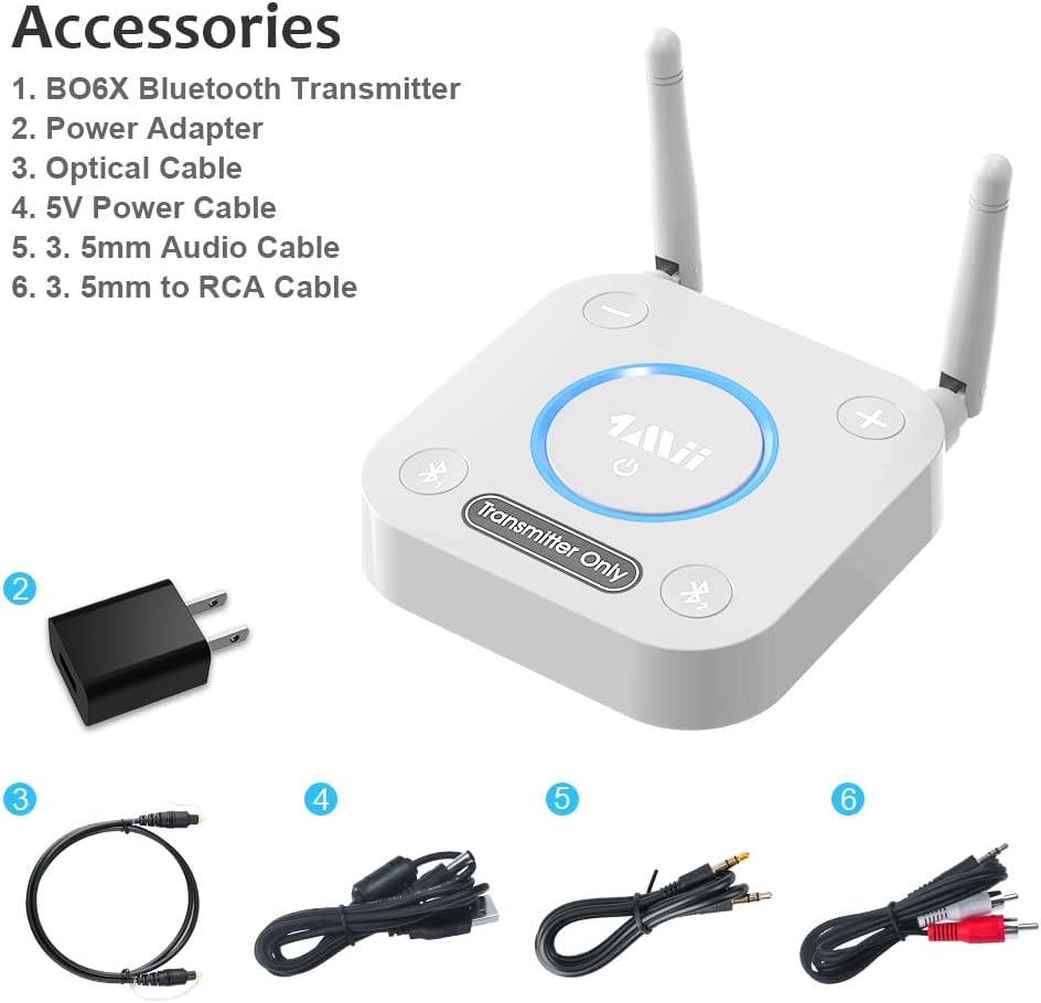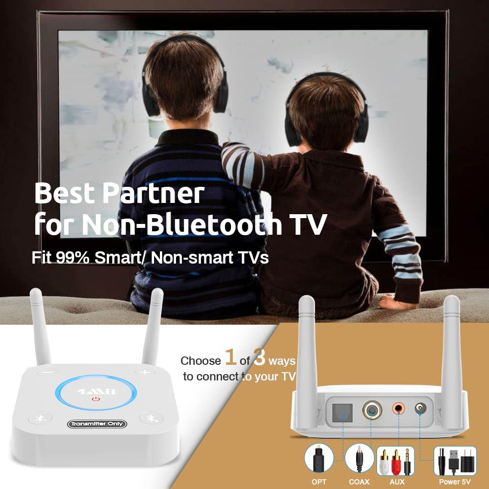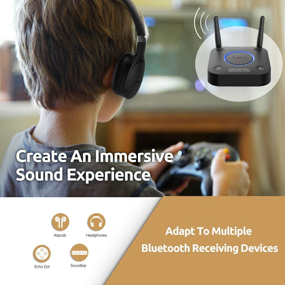 • 【LONGER RANGE,NO DELAY】 Dual antenna design amplifies the TV signal so you can hear the TV from anywhere in the house.Atpx technology eliminates the lip-sync delay..**Please ensure your headphone or speaker also with Atpx Low Latency technology.