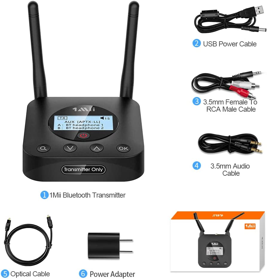 1Mii B06TX Bluetooth 5.0 Transmitter for TV to Wireless Headphone/Speaker, Bluetooth Adapter for TV w/Volume Control, AUX/RCA/Optical/Coaxial Audio Inputs, Plug n Play, aptX Low Latency & HD