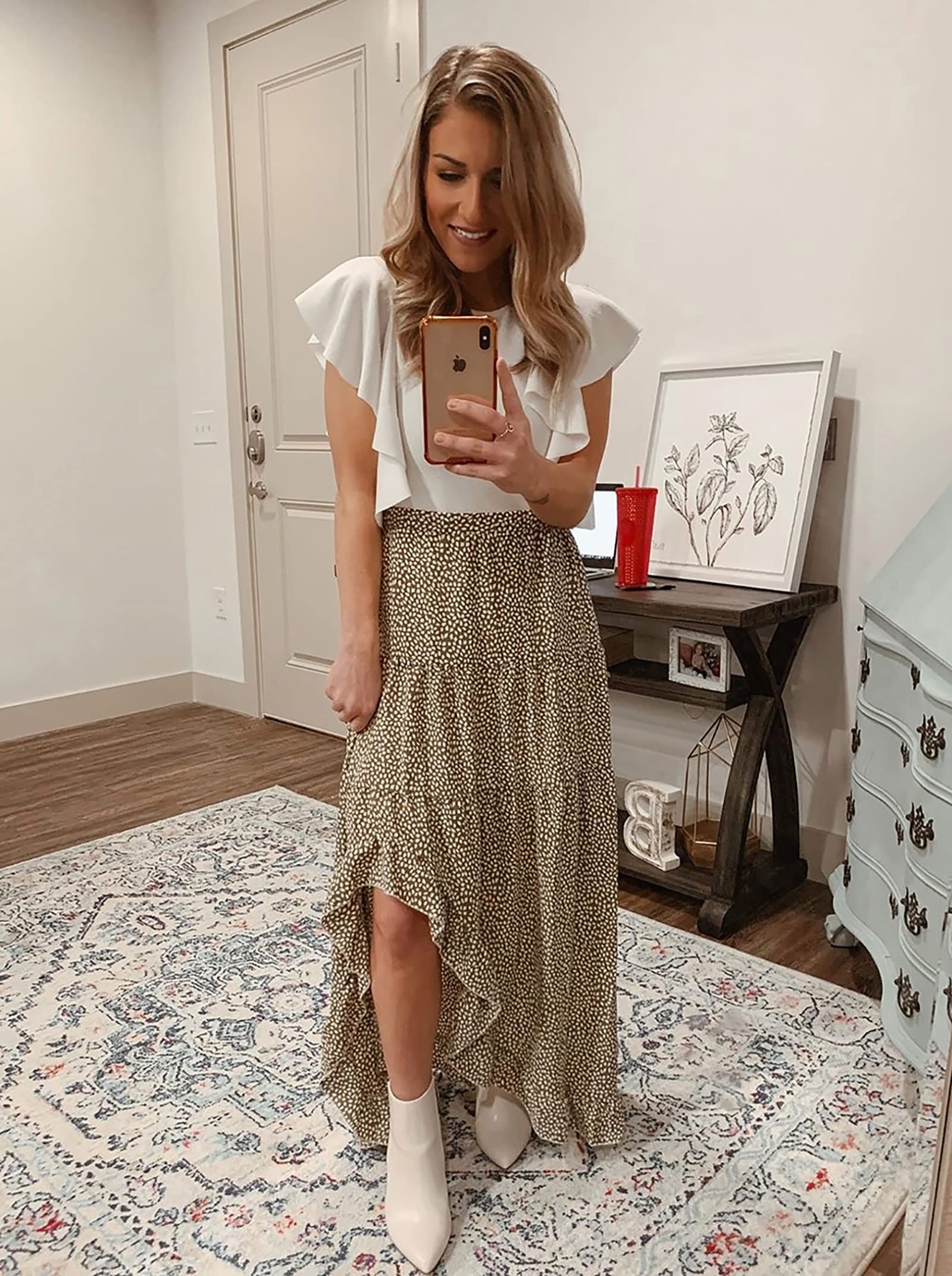• BTFBM maxi skirt features boho floral print and high-low ruffle hem showing legs