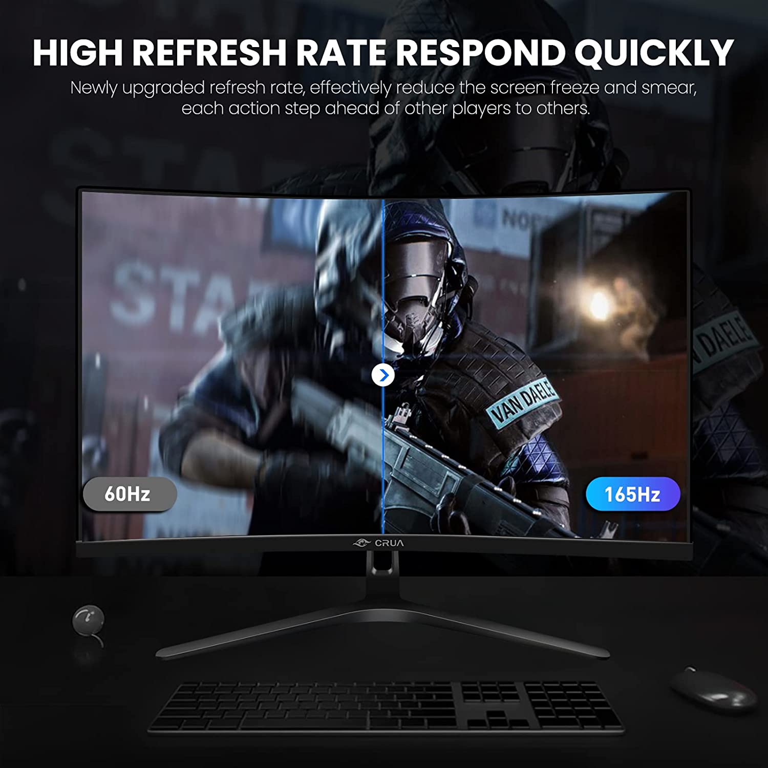 CRUA 24 inch 144hz/165hz Curved Gaming Monitor,FHD 1080P Frameless Computer Monitor,Support AMD freesync Low Motion Blur, Eye Care, VESA, DisplayPort, HDMI, Black