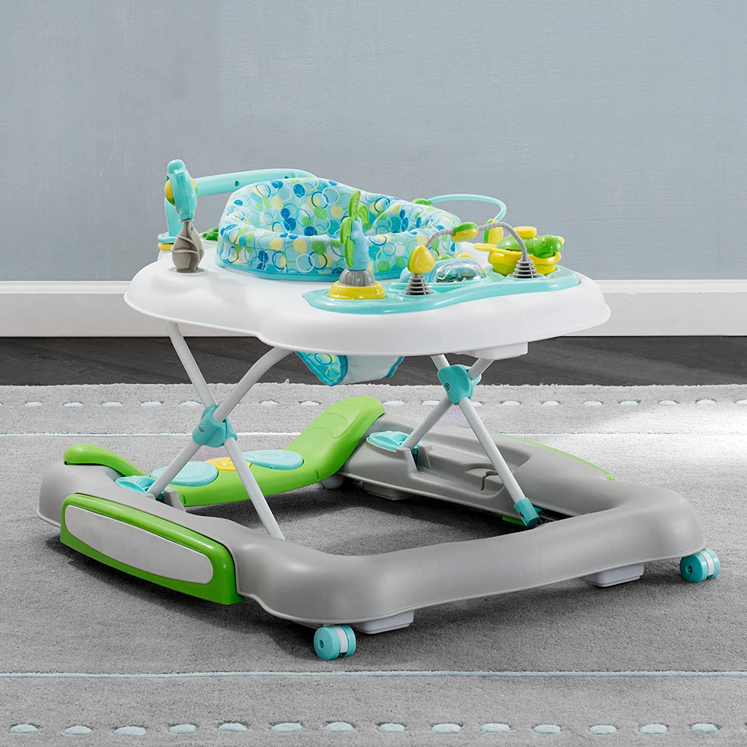 Delta Children 4-in-1 Discover & Play Musical Walker - Features 360 Degree Swivel Seat, Rocker and Walker Mode, Step-to-Play Music, Machine-Washable Seat, Blue/Green