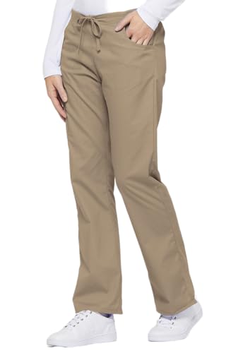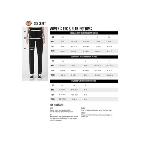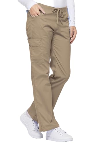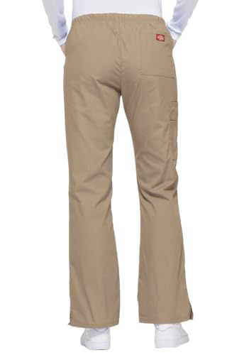 Details: A missy fit, mid-rise, flare leg pant features an adjustable drawstring with elastic at the back and Dickies logo twill tape on the inside back waistband. Also featured are patch pockets, a back pocket, and cargo pockets with a stretchy red knit interior pocket white knit pocket on white and side vents.