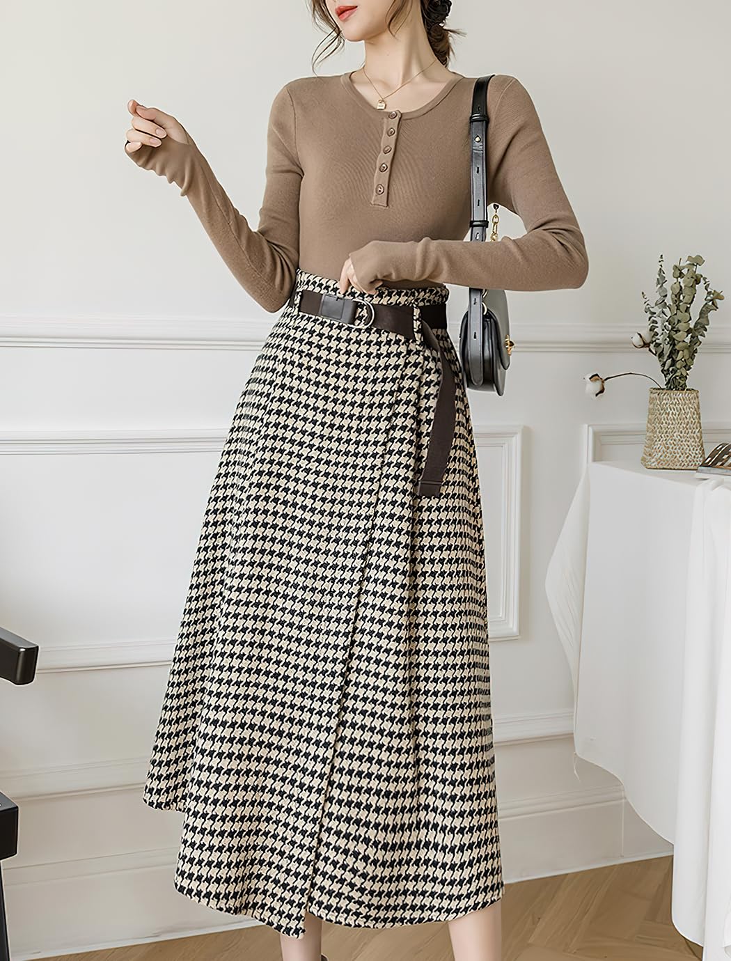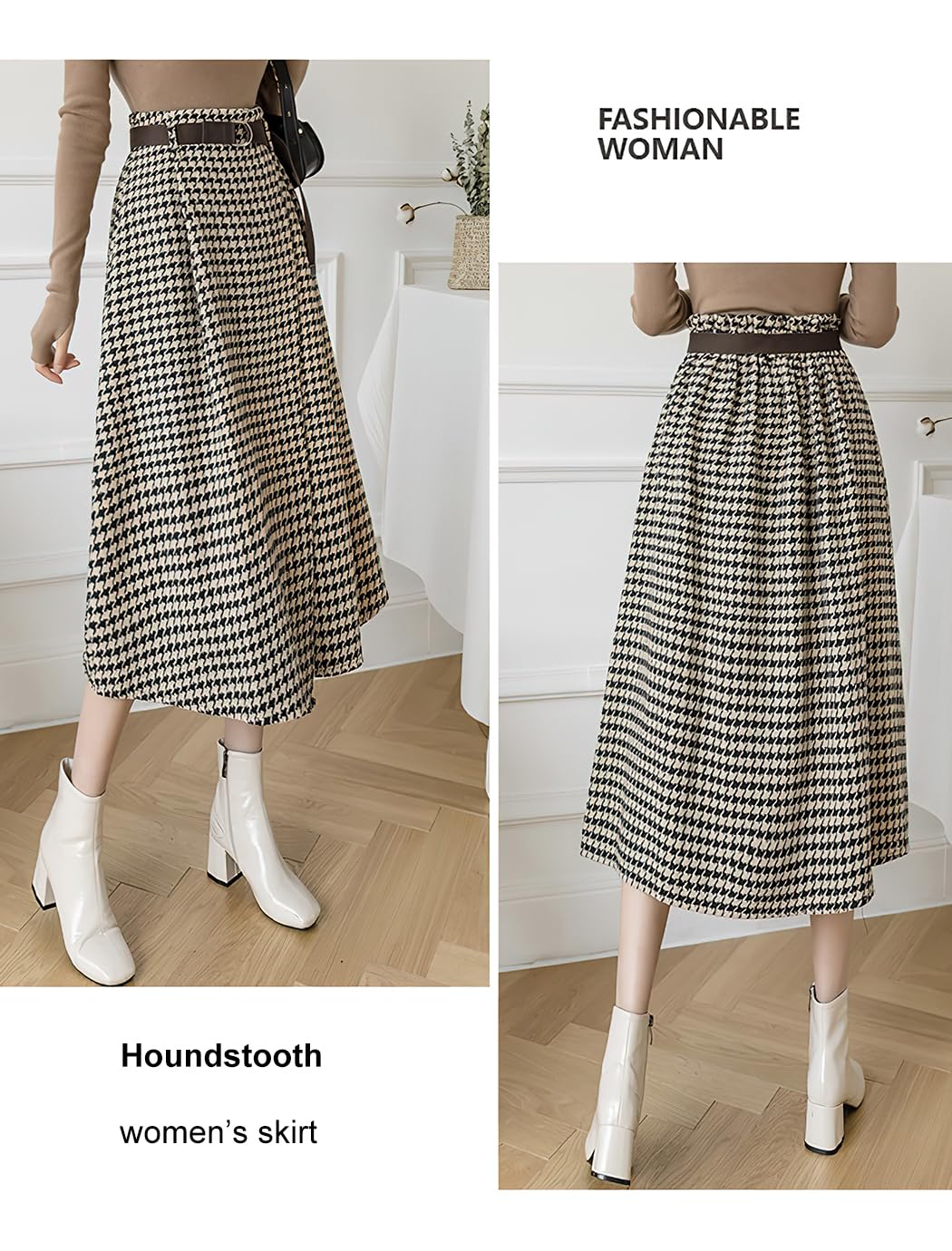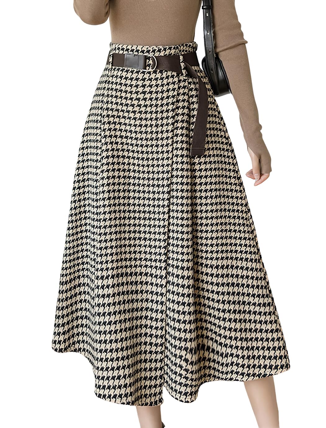 • Features high waist, self-belt, houndstooth and plaid style, mid-calf length, asymmetrical hem, pleated A-line flowy skirt for women