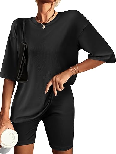 Ekouaer Womens Pajamas 2 Piece Lounge Sets Ribbed Knit Matching T-shirt Biker Shorts Outfits Sleepwear Loungewear