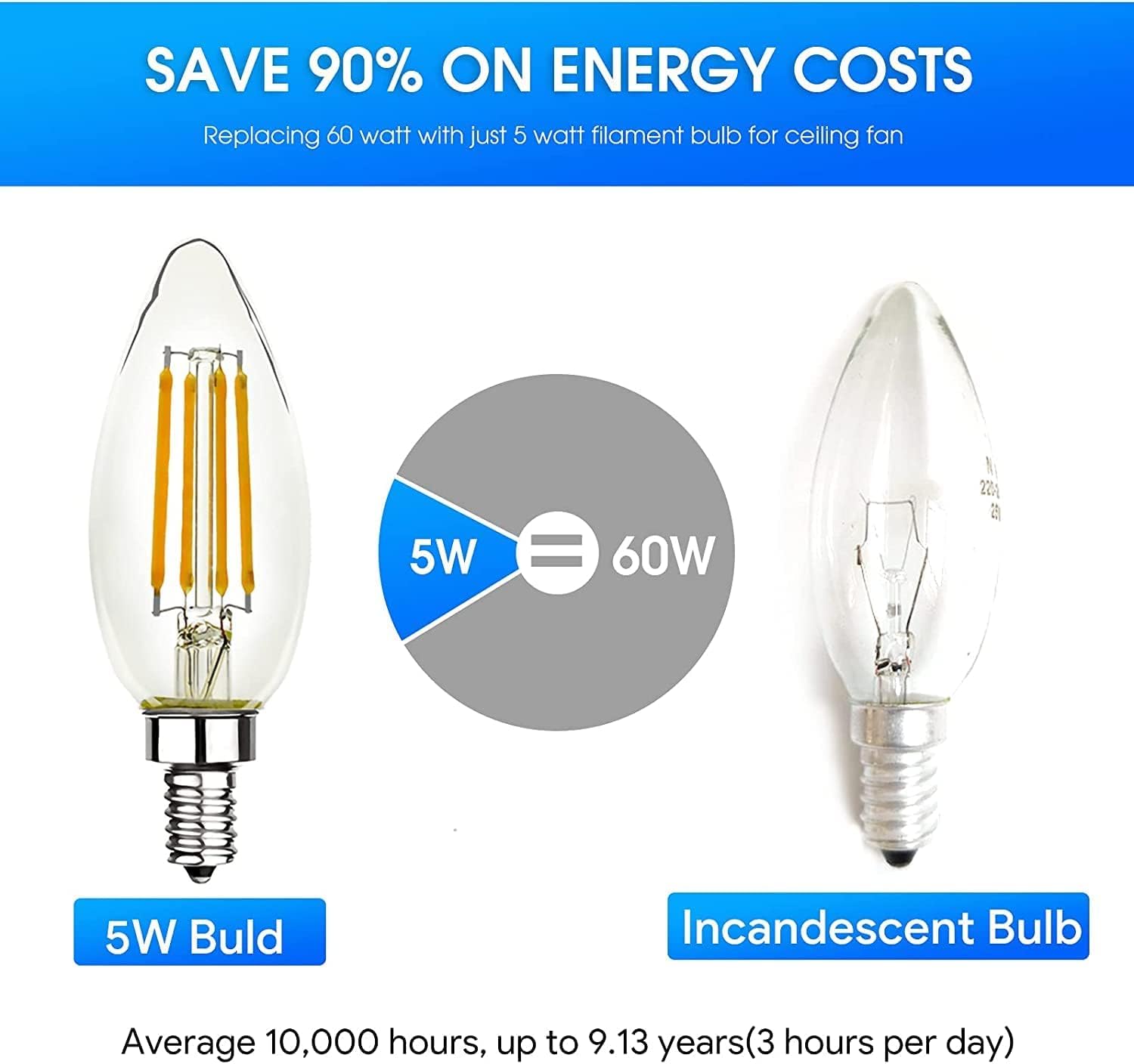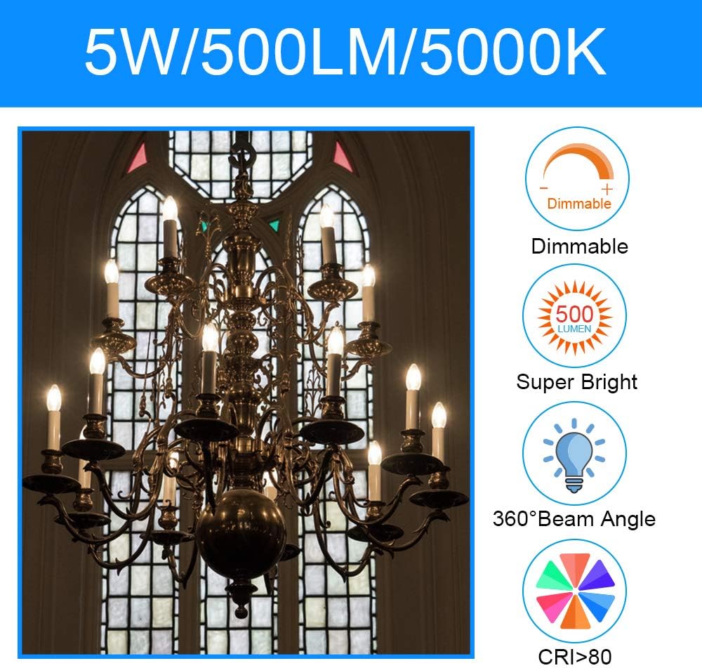 • ?【Energy Saving】Use only 5W candelabra LED bulbs emits 500 lumens of each light replace 60W incandescent candelabra chandelier light bulbs, save 92% on electricity bills.