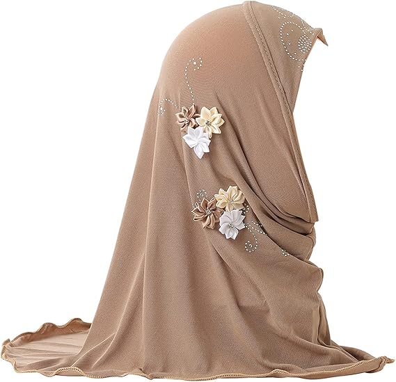 Kids One Piece Muslim Hijab and Cap for Girls Long Al Amira Islamic Ramadan Head Wrap Scarf Shawl with Rhinestone and Flower