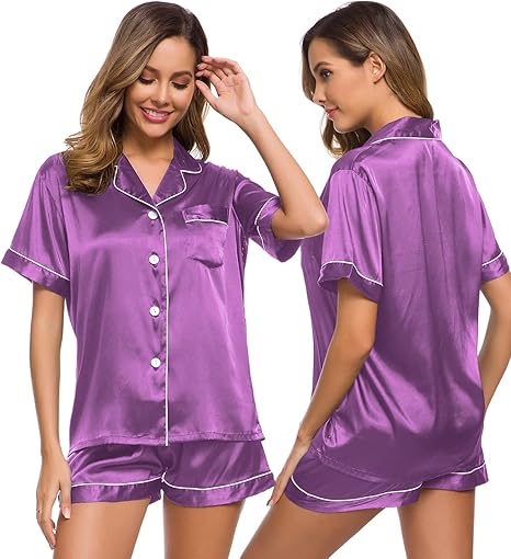 SWOMOG Womens Silk Satin Pajamas Set Short Sleeve Sleepwear Button Down Top and Shorts Loungewear 2 Piece Pjs Set XS-3XL