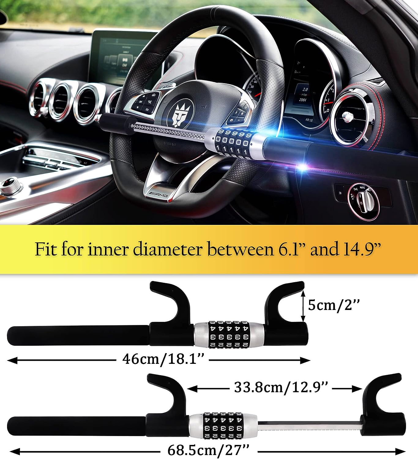 • ➤UNIVERSAL FIT - Adjustable and fit for a wide range of steering wheels with an inner diameter between 6.1 and 14.9 inches. The car steering wheel lock is universal for cars, vans, trucks, and SUVs. Each car lock includes 1 lock unit, 1 screwdriver, and 1 code resetter. If you are not satisfied with the purchase, or you have any questions, please contact us without hesitation.