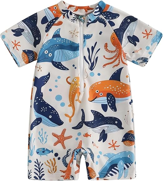 Toddler Baby Girl Boy Swimsuit Infant Zip Up Short Sleeve One Piece Swimwear Rash Guard Bathing Suit Sun Protection