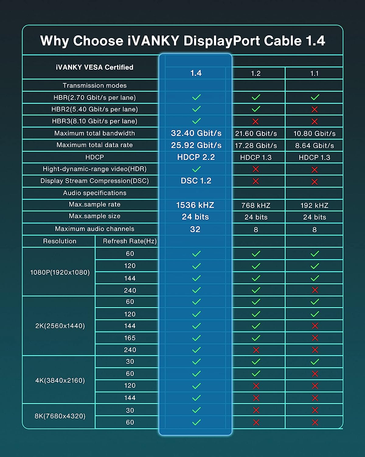 • 🎮【VESA Certified DP to DP Cable 1.4】This 8K DisplayPort Cable 1.4 is officially certified by VESA Association. iVANKY 8K DP Cable (NOT HDMI) supports high resolutions 8K(7680x4320)@60Hz, 5K(5120x2880)@60Hz, 4K@144Hz, 2K@240Hz, 1080P@240Hz and Dynamic HDR and HDCP 2.2. Backwards compatible with DisplayPort 1.3/1.2/1.1, etc.It also works fully with FreeSync and G-Sync.