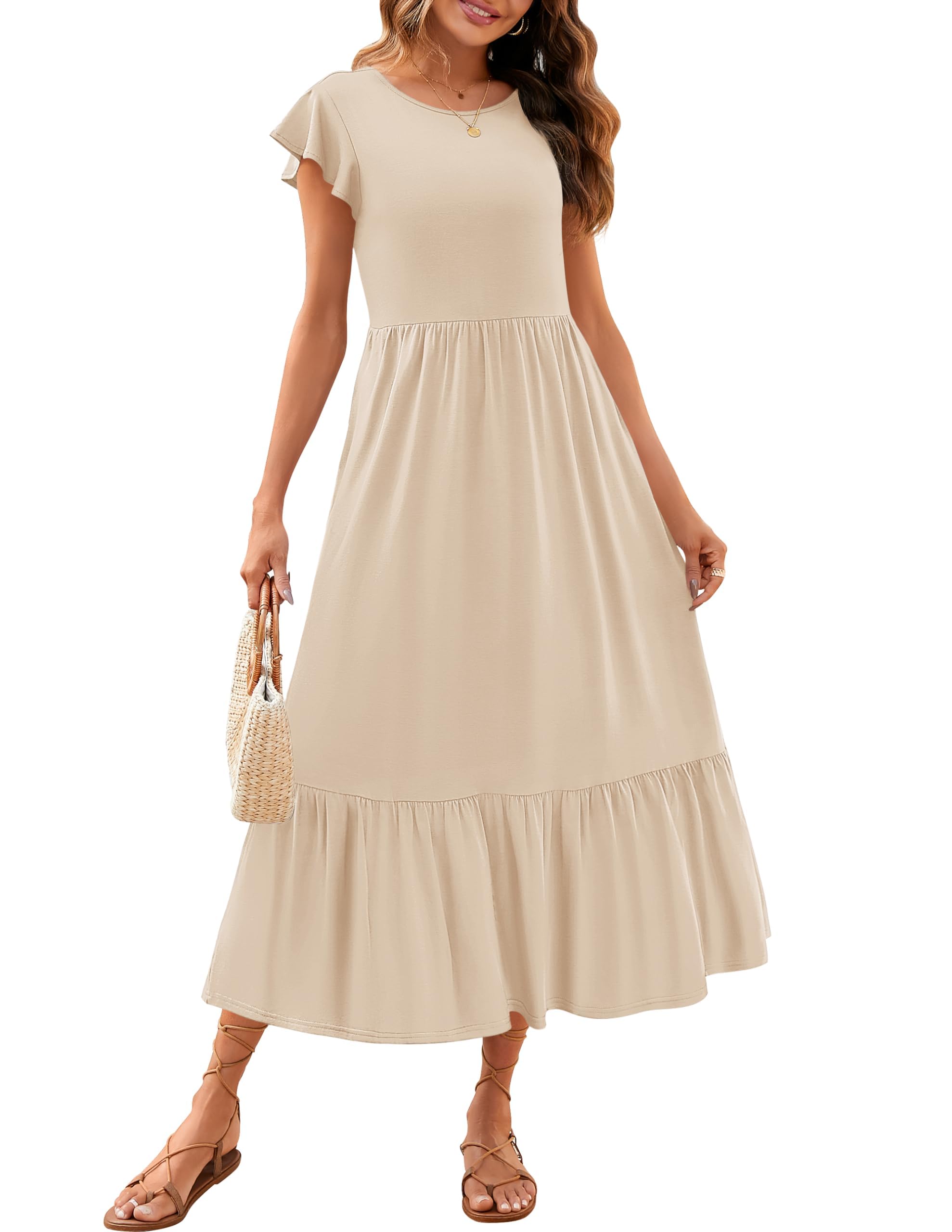 ZESICA Women's 2024 Summer Casual Dresses Flutter Short Sleeve Crewneck Loose Flowy Tiered Beach Maxi Dress with Pockets,Apricot,Large