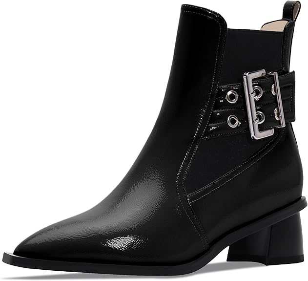 Women's Pointed Toe Chunky Block Heel Ankle Boots Buckle Strap Elastic Band Chelsea Booties