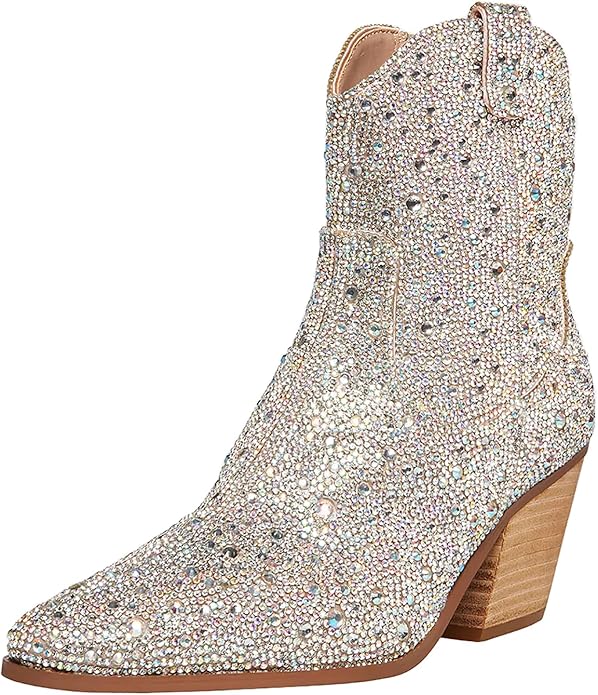 Women's Rhinestone Boots Western Mid Calf Pointed Toe Fashion Cowgirl Boots 5cm Chunky Stacked Heel Pull On Boots For Ladies