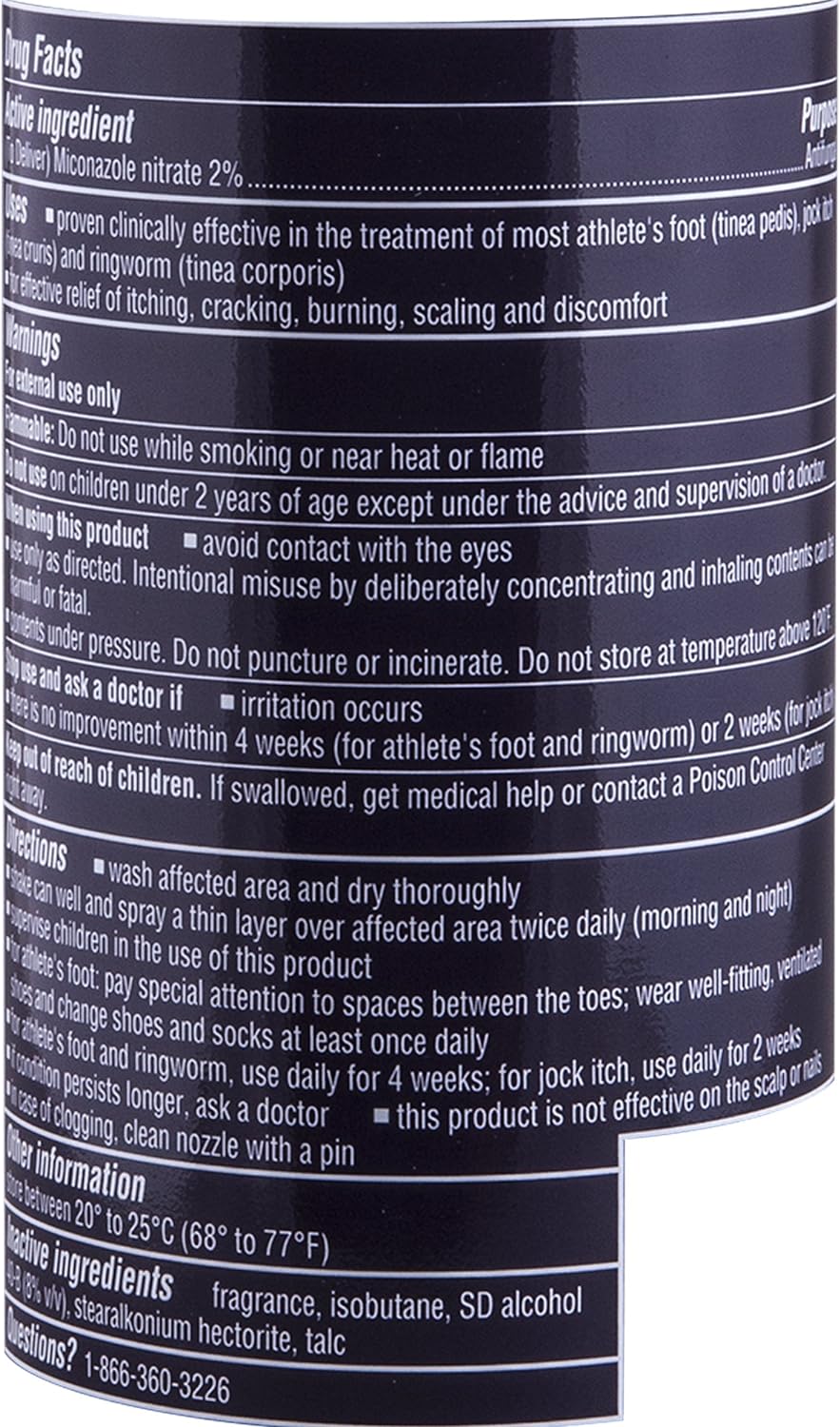 Get relief from the uncomfortable itching, burning, cracking, and scaling symptoms of athlete's foot with Lotrimin AF Athlete's Foot Deodorant Antifungal Powder Spray. The active ingredient in this athlete’s foot treatment is miconazole nitrate, which helps to relieve the discomfort of athlete’s foot and is clinically proven to cure most athlete's foot infections. Lotrimin Deodorant Foot Powder Spray is easy to apply and absorbs sweat, helping to keep your feet dry. Fight fungus with the power of Lotrimin AF Deodorant Foot Powder Spray – your tinea pedis is no match for this treatment that works to control the fungus that causes athlete’s foot. Lotrimin AF Deodorant Antifungal Foot Powder Spray can also be used to treat jock itch and ringworm. Safe for kids over 2.