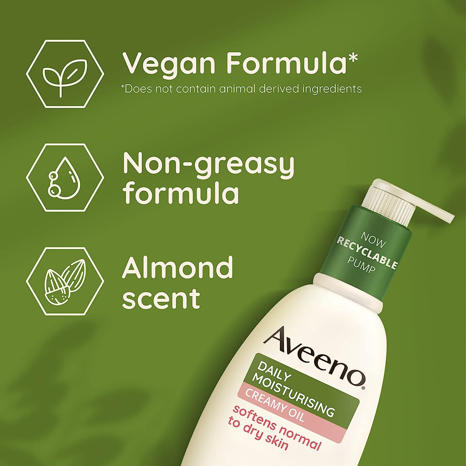 Aveeno Non-greasy Moisturising Cream Oil 300ml Sweet Almond Oil With Colloidal Oatmeal Moisturises like an oil, absorbs like a cream Moisturising Creamy Oil is formulated with the concentrated goodness of finely-milled naturally active Colloidal Oatmeal and Sweet Almond Oil, known for their moisturising properties. It combines the benefits of an oil with the convenience of a cream, helping to maintain the skin's natural moisture level and prevent dry skin. Skin is left looking and feeling soft, smooth and healthy without a greasy after-feel. INGREDIENTS: AQUA, SESAMUM INDICUM (SESAME) SEED OIL, DI-PPG-3 MYRISTYL ETHER ADIPATE, HYDROGENATED POLYDECENE, DIMETHICONE, GLYCERINE, CETYL ALCOHOL, PRUNUS AMYGDALAS DULCIS (SWEET ALMOND ) OIL, AVENA SATIVA (OAT) KERNAL OIL, AVENA SATIVA (OAT) KERNAL FLOUR, CAPRYLYL GLYCOL, LAUROYL LYSINE, p-ANISIC ACID, ACRYLATES/C10-30, ALKYL ACRYLATE CROSSPOLYMER, MYRISTYL ALCOHOL, GLYCERYL STREARATE, STEARYL ALCOHOL, PEG-100 STEARATE, MAGNESIUM ALUMINIUM SILICATE, TITANIUM DIOXIDE, XANTHIUM GUM, TATRASODIUM EDTA, SODIUM HYDROXIDE, CITRIC ACID, BHT, PARFUM.