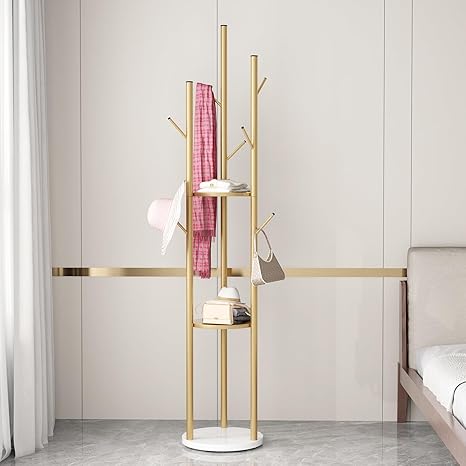Gold Coat Racks Freestanding with 3 Storage Shelves, Metal Coat Racks Stand with 9 Hooks and Heavy Marble Base, Entryway Coat Racks Tree Hanger, Purses Racks