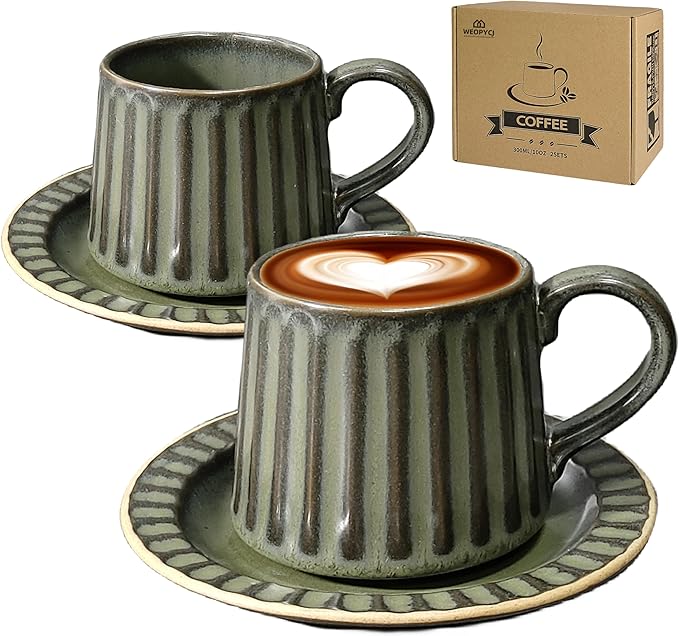 Coffee Cup Mug with Saucer, Large Ceramic Teacup and Saucer Set of 2 Porcelain Tea Cups and Saucers for Latte Cappuccino Tea (10oz/Green)