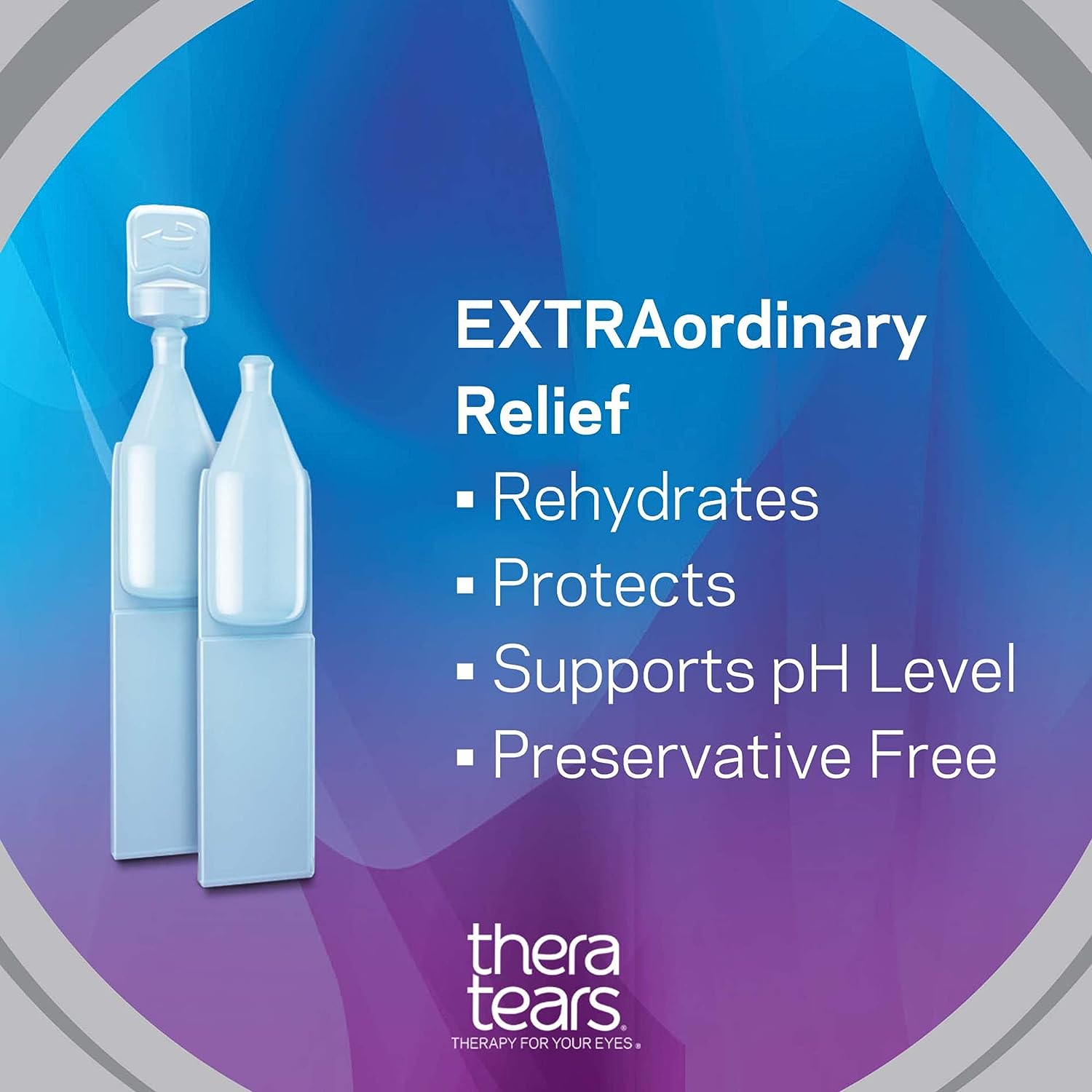TheraTears Extra Dry eye Therapy lubricant Eye Drops are extra moisturizing to rehydrate dry eyes, protect from further irritation and support the natural tear pH level. The unique formula is preservative free for sensitive eyes and severe dry eye sufferers. Dry eye can be caused by a salt imbalance in your tears. TheraTears with osmo-correction and a unique hypotonic and electrolyte balanced formula replicates healthy tears to restore your eyes natural balance for extraordinary relief of dry eye symptoms. TheraTears Dry Eye Therapy is available in a convenient, single-use vials sealed In foil pouches to ensure they are as fresh as natural tears. TheraTears is not only recommended by eye doctors, it was created by an ophthalmologist after 18 years of researched with sponsorship from the National Eye Institute. The formula is perfect for at home and on the go and is part of the TheraTears Dry Eye Therapy line for more complete dry eye symptom relief. TheraTears, more than just eye drops, dry eye Therapy.