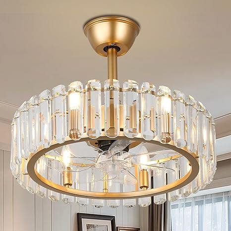 FRIXCHUR Modern Crystal Fandelier Ceiling Fan with Lights Gold Chandelier Fan for Dining Room Bedroom, 20.7 Inch, 6-Speed