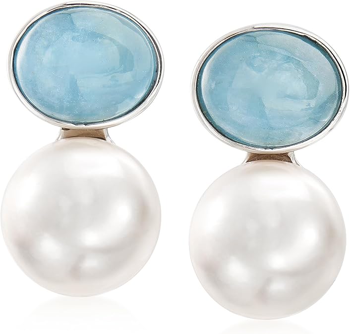 Ross-Simons 13.5-14mm Cultured Pearl and 10.00 Aquamarine Earrings in Sterling Silver