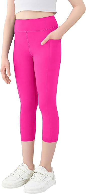 Girls Athletic Capri Leggings, Kids Yoga Pants with Pockets, Teen Girls Stretch Dance Running Workout Pants