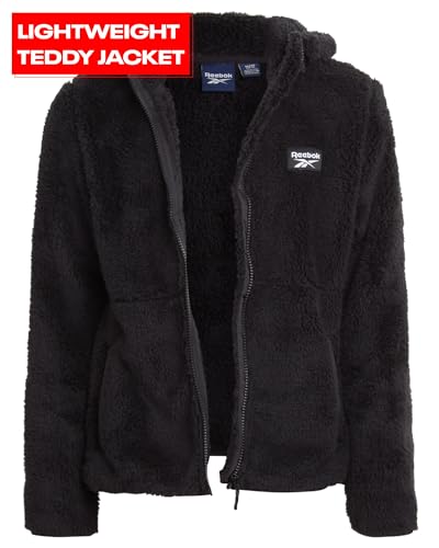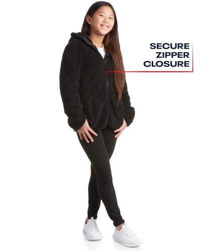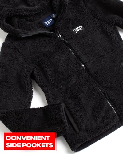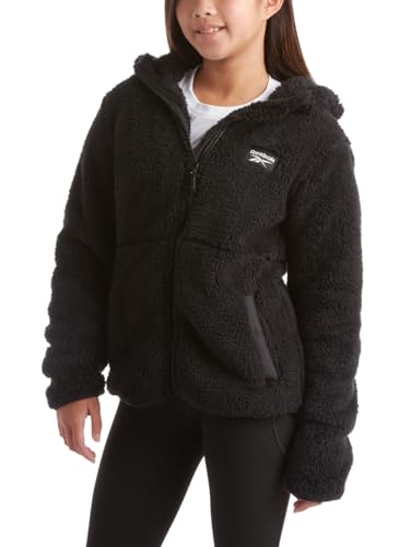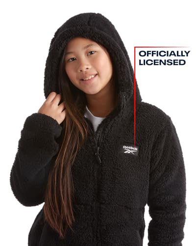 Reebok Girls’ Fleece Jacket – Full Zip Sherpa Fleece Hooded Sweatshirt Jacket – Faux Fur Teddy Coat for Girls (7-16), Size 7-8, Black