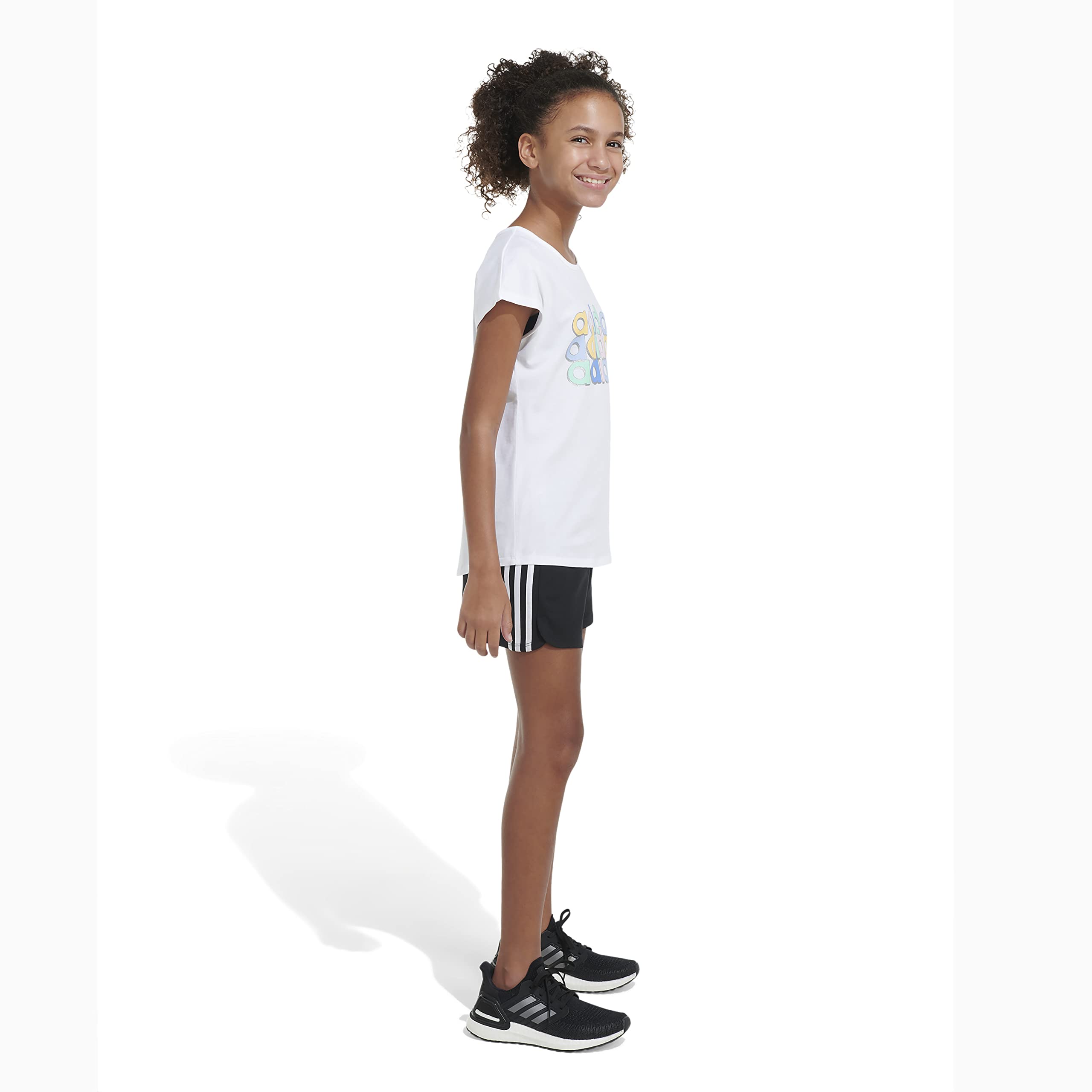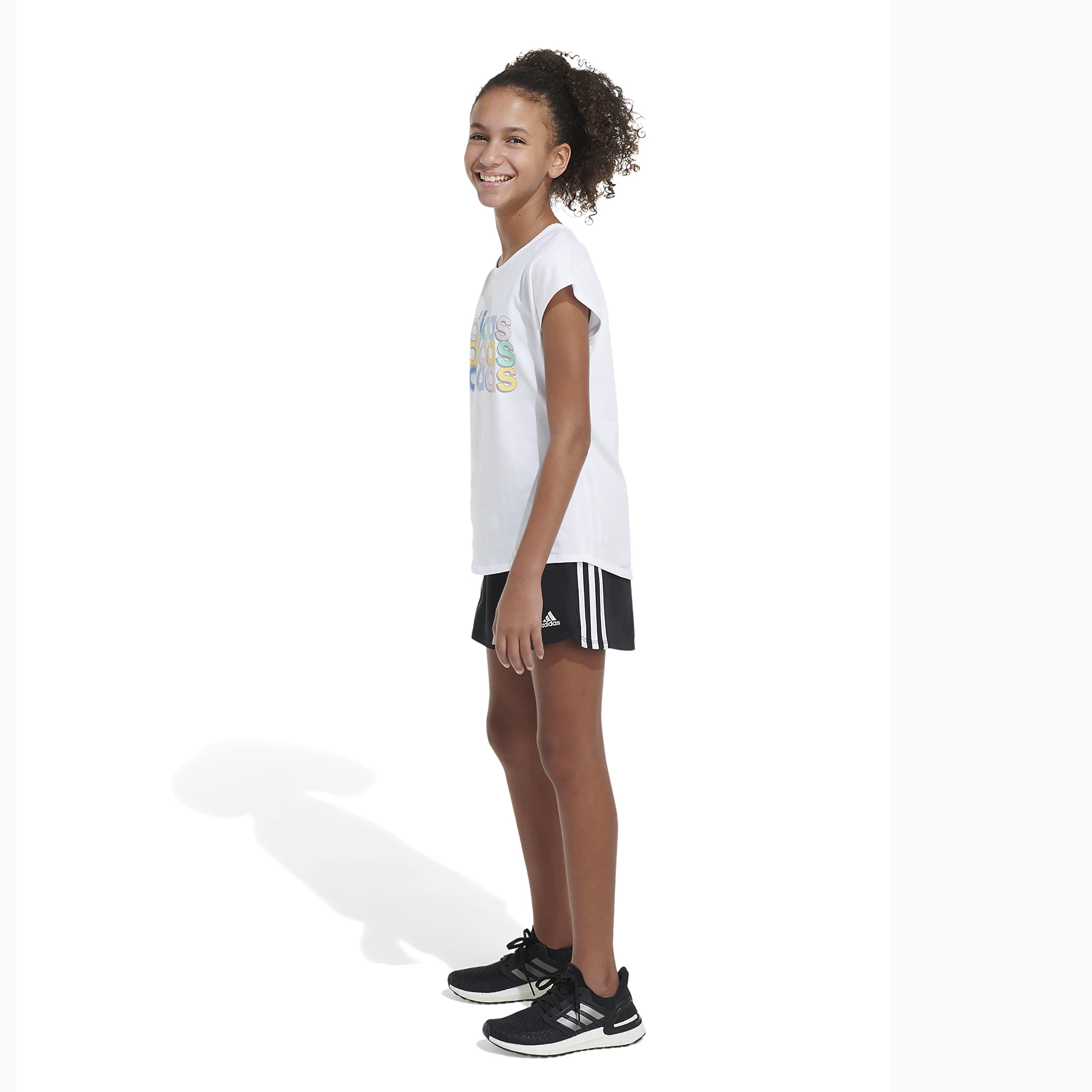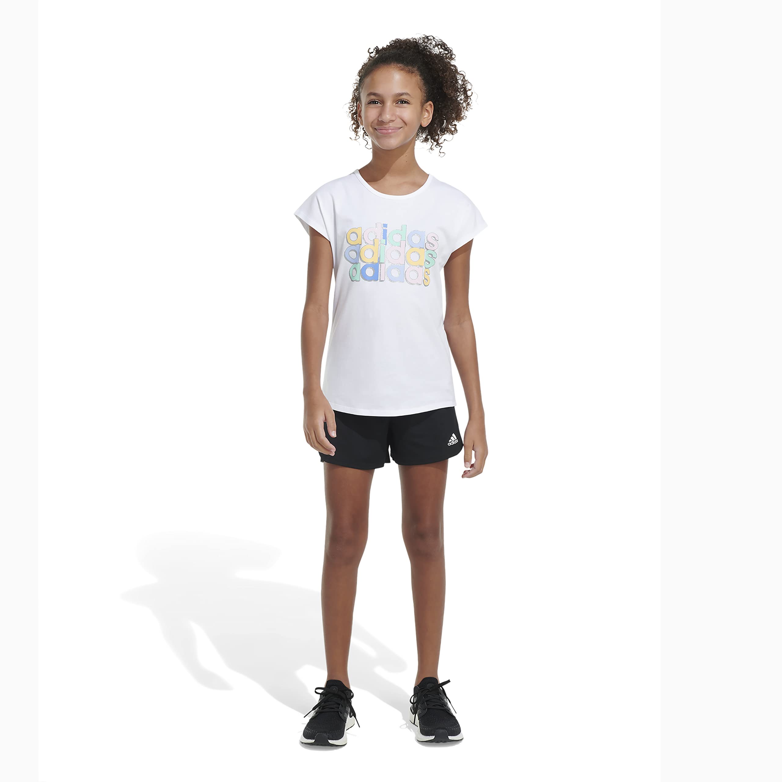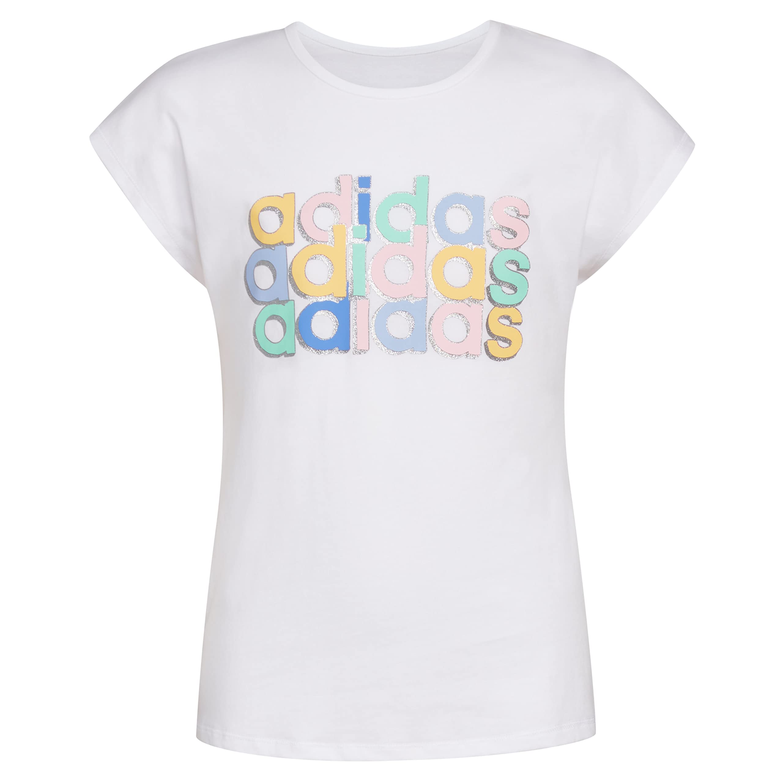 Details: Level up her adidas t-shirt game. This girls' tee adds colorful details and expressive graphics to an iconic style. Soft cotton feels lived-in fresh from the box. Extra room in the shoulders and a slightly longer hem in back make it comfortable.