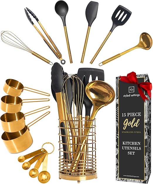 Styled Settings Black and Gold Kitchen Utensils Set - 15 Piece Gold Utensils Set Includes Non-Stick, BPA-Free, Black Silicone and Gold Cooking Utensils Set and Gold Measuring Cups and Spoons Set