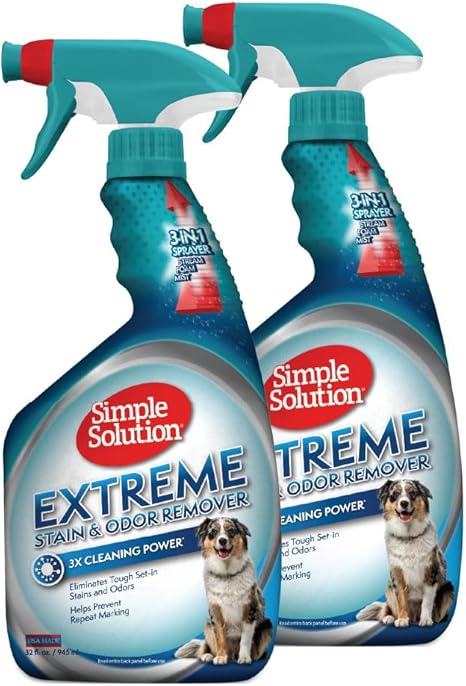 Simple Solution Extreme Pet Stain and Odor Eliminator Spray for Dogs & Cats, Enzyme Cleaner With 3X Pro-Bacteria Cleaning Power- Strong Urine Pee & Poop Carpet & Floor Stain Remover, 32 oz (Pack of 2)