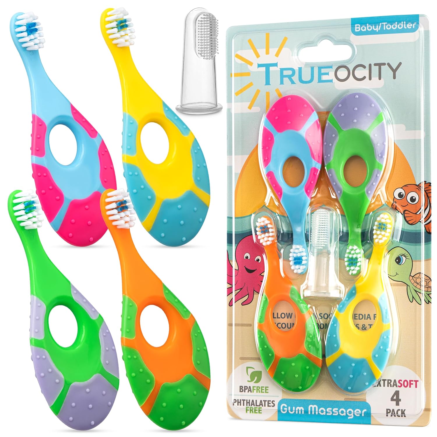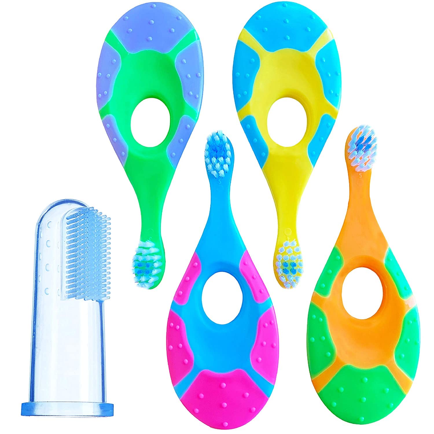 Baby Toothbrush 4 Pack, Toddler Toothbrush Age 1-2 & Bonus Silicone Finger Brush, Soft Bristles, Toddler Toothbrushes, Infant & Training w/Teething Handle, 0-2 Years, Multi Color Set