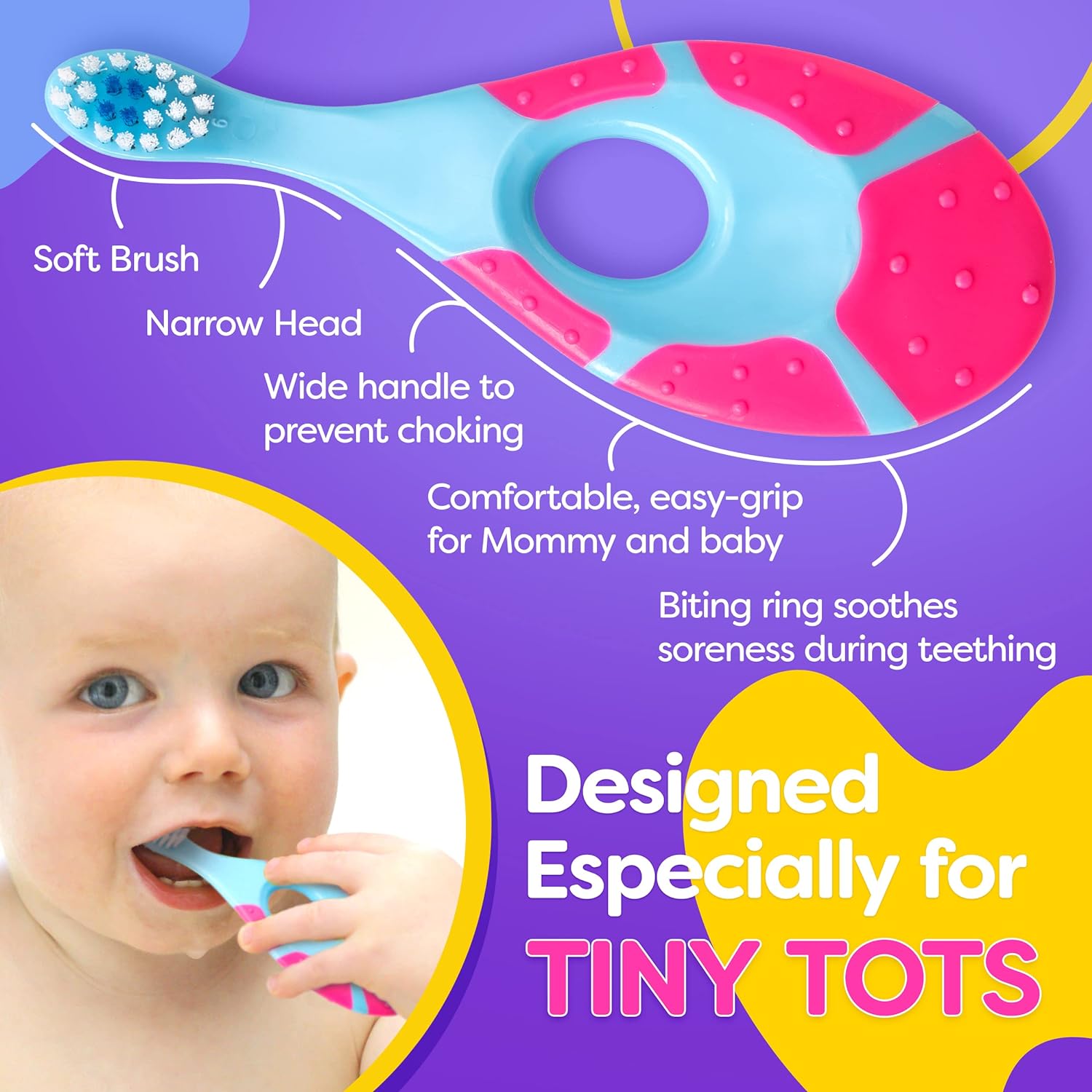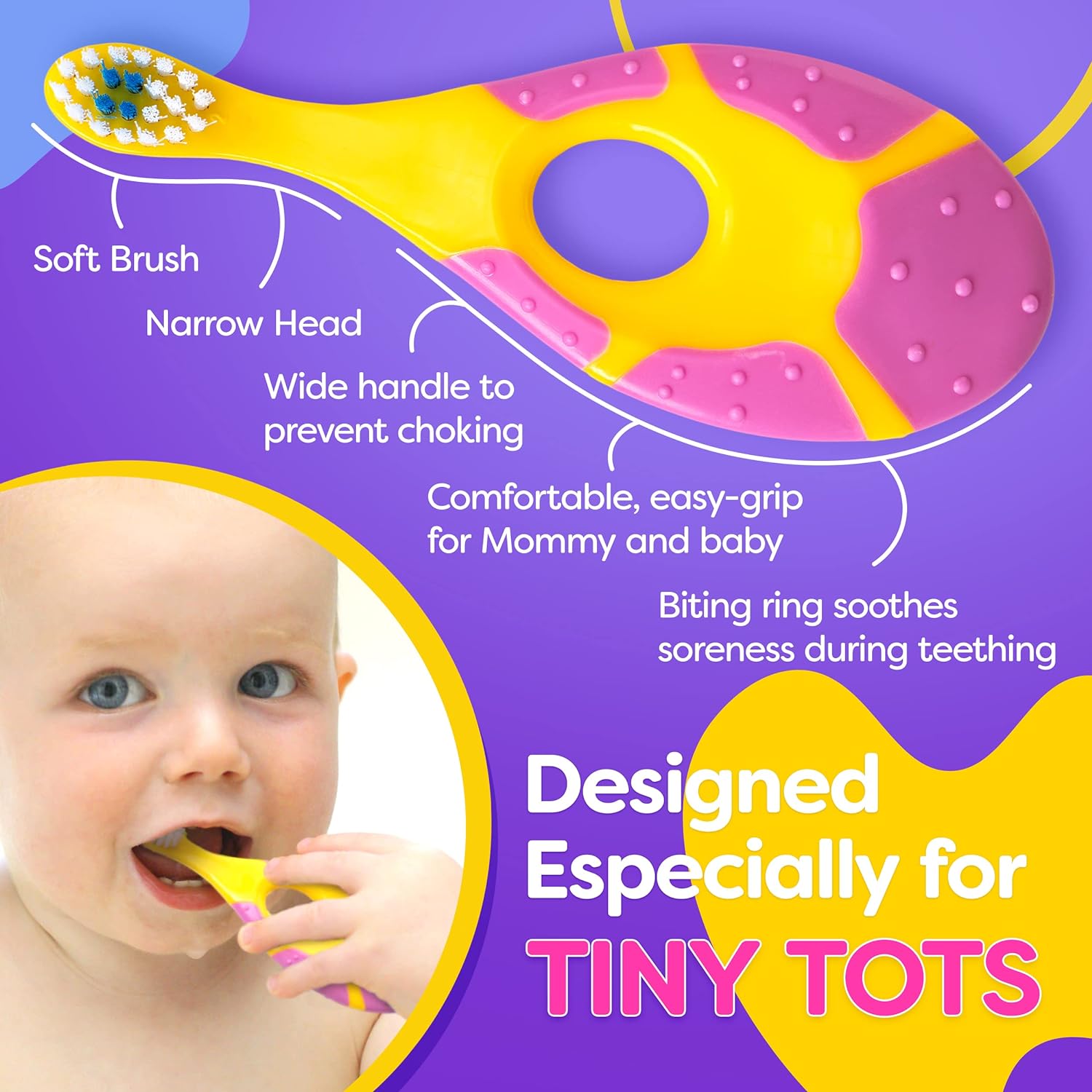 • ✅ PERFECT FOR LITTLE HANDS - Designed with small heads, soft bristles, and handles specifically for little hands to hold. The wide body of the brush and the short neck help prevent your little one from choking as they learn, so that they can teethe and brush safely.