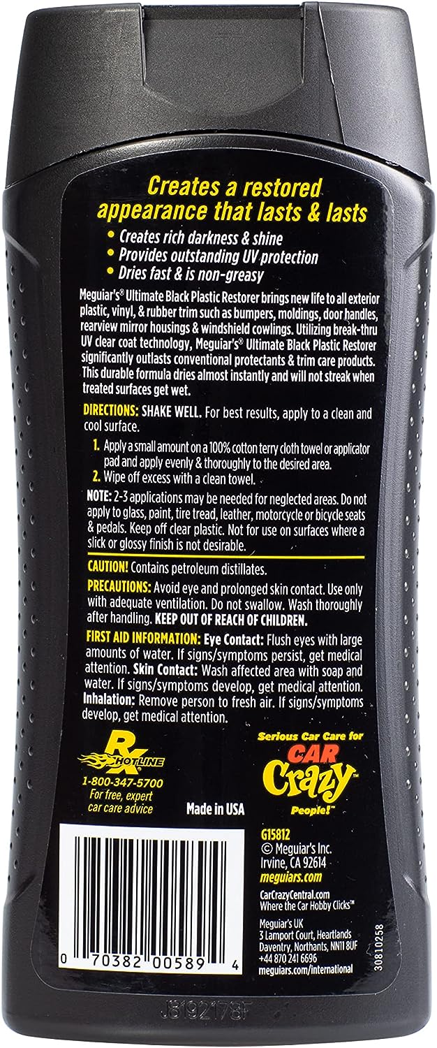 Meguiar’s Ultimate Black trim restorer gives new life to all exterior plastic, vinyl and rubber trim such as bumpers, moldings, door handles, side view mirror housings and windshield cowlings. With breakthrough UV clear coat technology, Ultimate Black significantly outlasts conventional protectants and trim care products, providing a darkness and shine that lasts even after 100 washes. The convenient aerosol spray makes for easy application – simply spray on and walk away. Our non-greasy formula dries almost instantly and will not streak when wet.