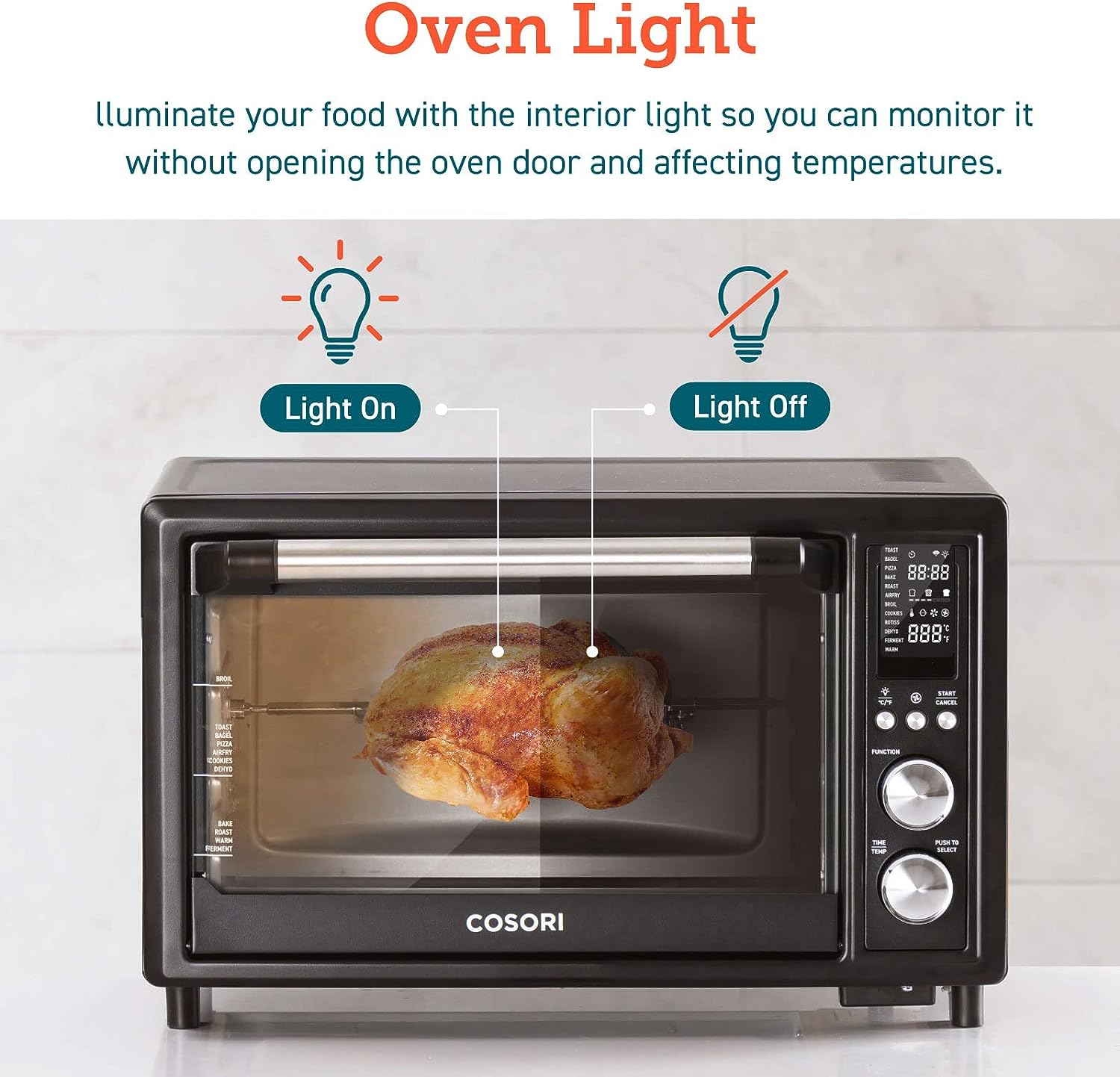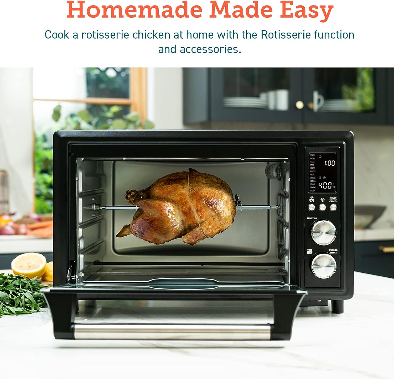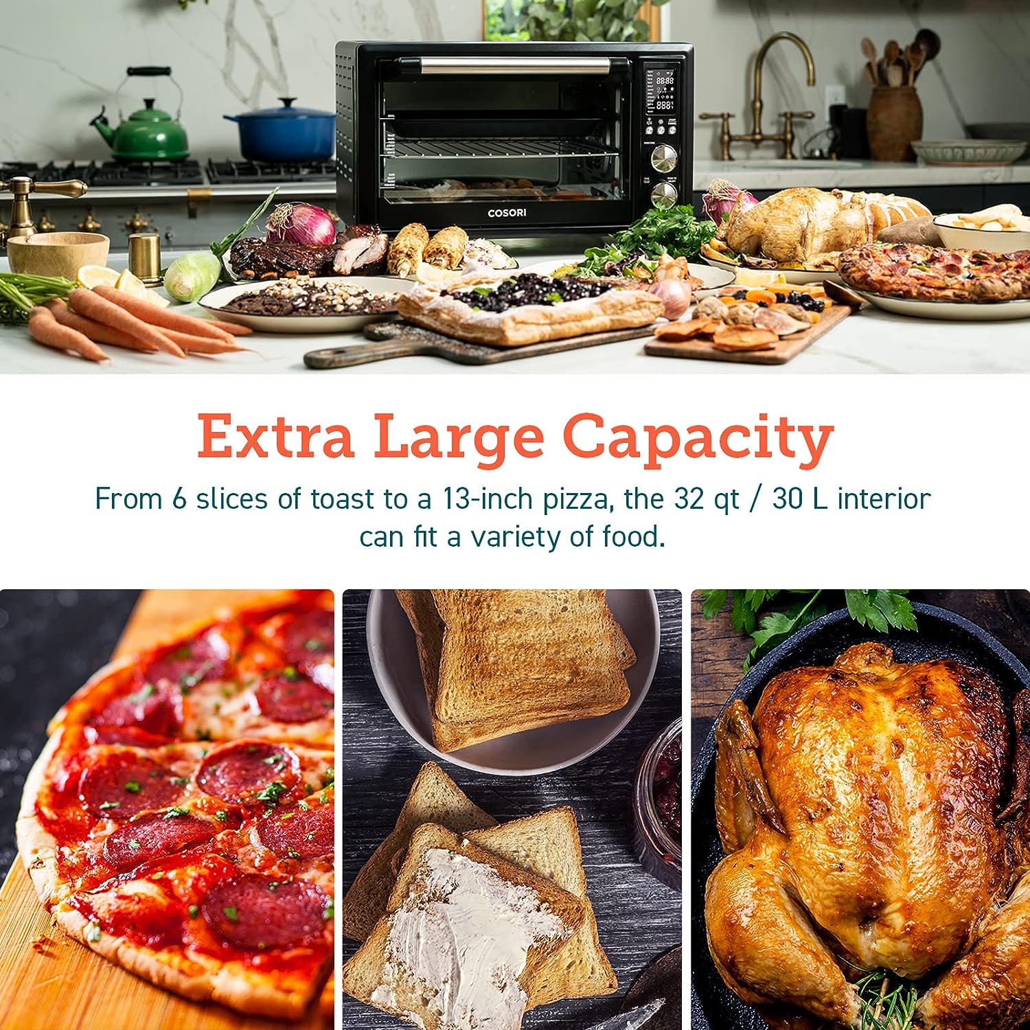 • FULLY MEET FAMILY NEEDS: 2-layer even cooking, The oven’s 26 quart / 25-liter capacity 1 layer fits up to 6 slices of bread, a 12-inch pizza, or a 5lbs whole chicken