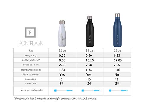 Details: Your search for the best water bottle is over! Say hello to the best Retro Sports Water Bottle out there, IRON FLASK! PLASTIC WATER BOTTLES? NO THANKS! The IRON FLASK Retro sports water bottle is made of premium 18/8 stainless steel that is 100% BPA FREE. This sports water bottle will keep your drinks cold & hot for many hours! It will also never sweat no matter what the drink temperature. ARE YOU TIRED OF LOW QUALITY WATER BOTTLES THAT SWEAT AND LEAK? We all tried bottles that sweat and leak! Well, try the IRON FLASK that comes with a Bottle Cleaning Brush so you could wash your retro sports water bottle easily. LOOKING FOR A WATER BOTTLE TO CARRY ANYWHERE? This double wall insulated water bottle will meet all your needs! Whether you fill it with boiling water or a pack of ice, the bottle will never get hot or cold to carry! You can use at the office, the gym, or even for outdoor activities such as camping and hiking! What are you waiting for? Go ahead and order the #IRONFLASK already! Lifetime Warranty against manufacturing defects if registered through our website Share a picture of your Iron Flask on Instagram with the #ironflask and by tagging @ironflask Please note that only the 12 Oz & 17 Oz Iron Flask Retro Bottles fit in cup holders.