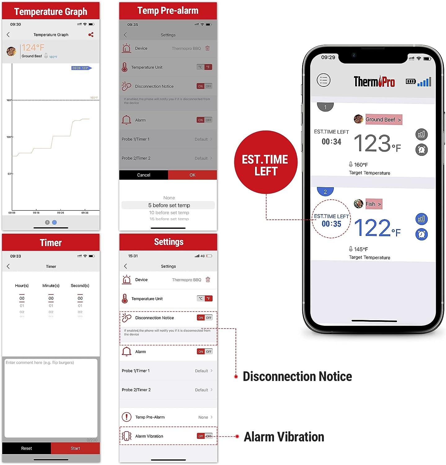 • Advanced Cook Time Estimator & Temp Track Graph: Better manage your time with the help of the intelligent cook time estimator, which informs you how much time until target temp is reached; Bluetooth grill thermometer records a history of your probes' temperatures, then creating a chart in real time