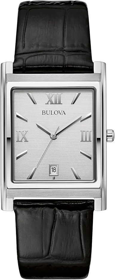 Bulova Men's Stainless Steel 3-Hand Calendar Date Quartz Watch with Black Leather Strap, Rectangle Dial Style: 96B107