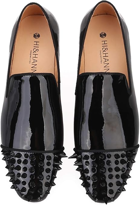 HI&HANN Black Patent Leather Men Loafers with Black Long and Short Rivet Toe Slip-on Loafer Men Flats