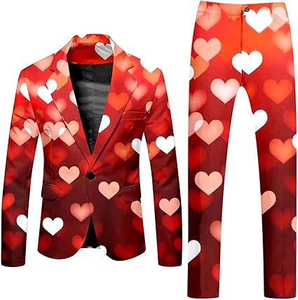Mens Suit 2 Piece Slim Fit Mens Valentines Day Printing Fashion Casual Life Party Dress Up Suit Jacket Pants Set
