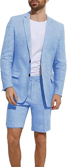 Wangyue Men's 2 Piece Linen Suits Set Linen Blazer Short Pants Slim Fit Casual Summer Beach Seersucker Suit