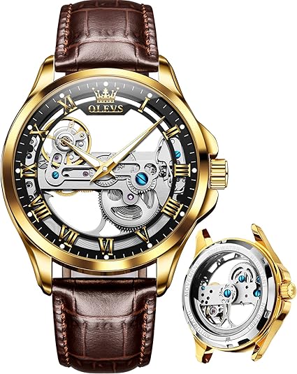 OLEVS Automatic Mechanical Watches for Men Skeleton Watch Waterproof Brown Black Leather Band Rose Gold Men's Wrist Watches