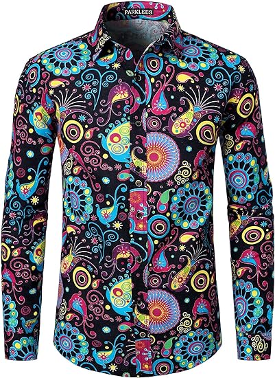 Men's Cotton Linen 70s Disco Retro Traditional Pattern Printed Long Sleeve Button Down Shirt