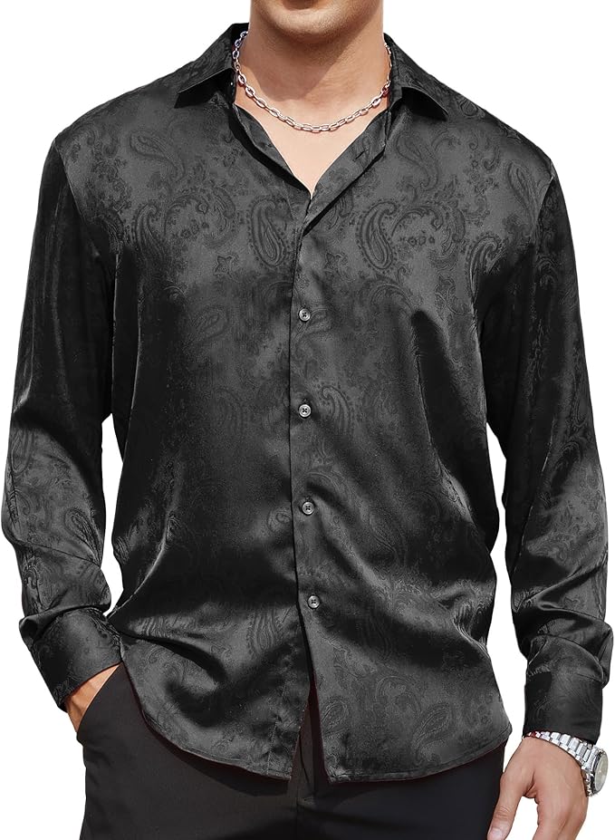 WARHORSEE Mens Silk Satin Dress Shirts Shiny Long Sleeve Button Down Shirt Party Prom Wedding Shirt