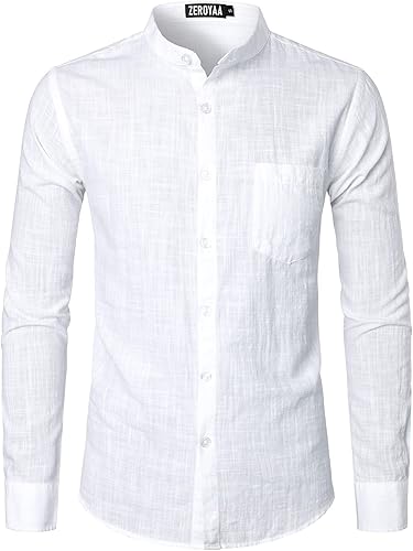 ZEROYAA Men's Fitted Cotton Linen Long Sleeve Banded Collar Button Up Shirts Lightweight Beach Tops with Pocket