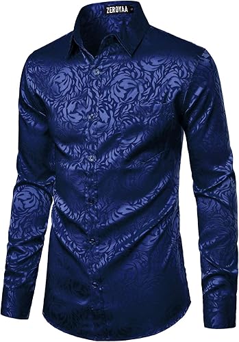 ZEROYAA Men's Hipster Jacquard Long Sleeve Satin Silk Like Button Up Dress Shirts for Party Prom
