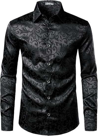 ZEROYAA Men's Luxury Jacquard Long Sleeve Dress Shirt Shiny Satin Slik Like Wedding Party Prom Shirts