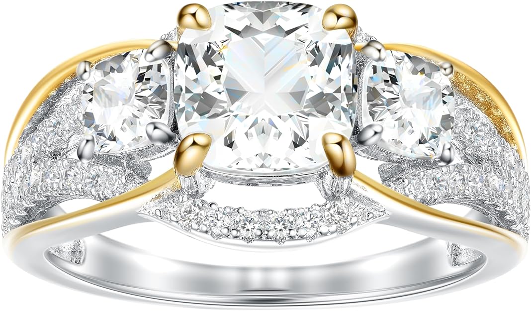 Hidden Gems Jewelry Sterling Silver Two Tone 3 Stones Clear CZ Cushion-cut 14K Gold Set in Rhodium Plating Engagement Rings for Women | Silver Rings for Women | Jewelry for Women