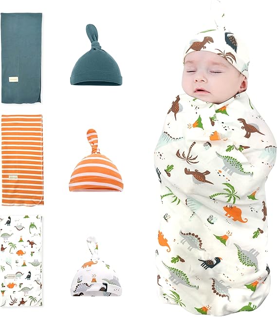 Newborn Swaddle and Hat Set 3 Pack 100% Cotton Knitted Muslin Baby Blankets 35" x 35" Baby Receiving Blankets Stroller Soft Unisex Newborn Swaddle Wrap for Girls and Boys (Dinosaur+Stripes+Green)