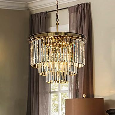 6-Light Modern Antique Gold 3-Tier Round Fringe Crystal Chandelier Brass Finish Frame Close to Ceiling Dual-Use Light for Dining Room Living Room W 20"